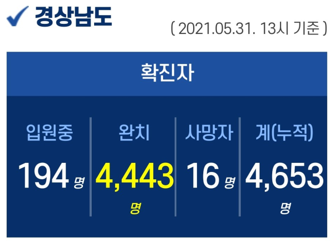 31일 오후 1시 30분 기준, 경남도내 입원 중인 확진자는 194명이고, 퇴원 4443명, 사망 16명, 누적 확진자는 총 4653명이다.