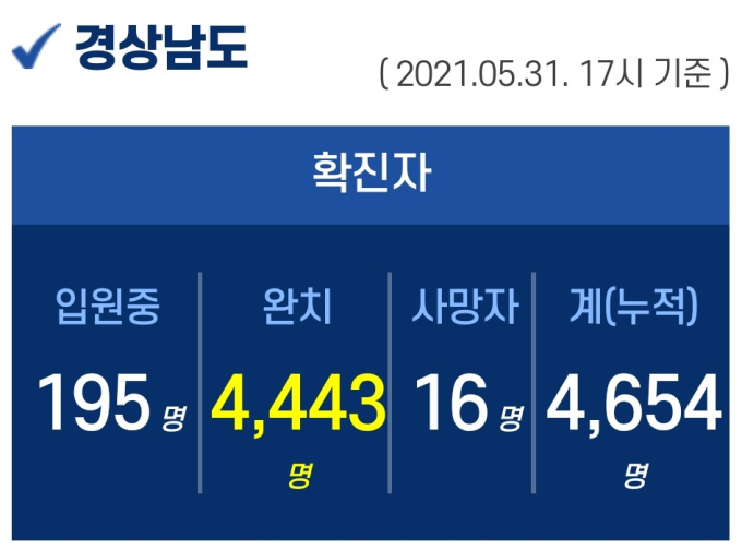 31일 오후 5시 기준 경남도내 입원 중인 확진자는 195명이고, 퇴원 4443명, 사망 16명, 누적 확진자는 총 4654명이다.