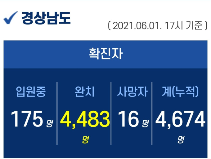 1일 오후 5시 기준, 경남도내 입원 중인 확진자는 175명이고, 퇴원 4483명, 사망 16명, 누적 확진자는 총 4674명이다.