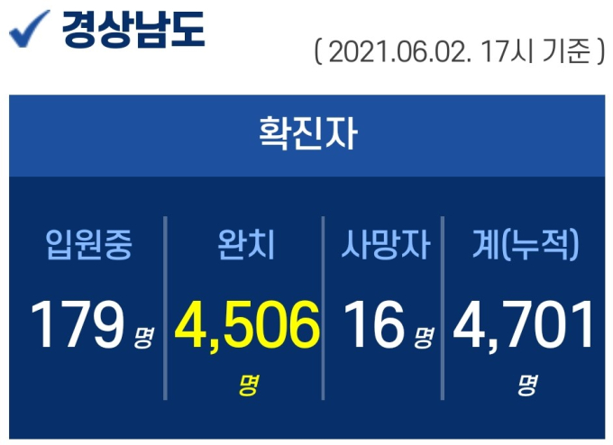 2일 오후 5시 기준 경남도내 입원 중인 확진자는 179명이고, 퇴원 4506명, 사망 16명, 누적 확진자는 총 4701명이다.