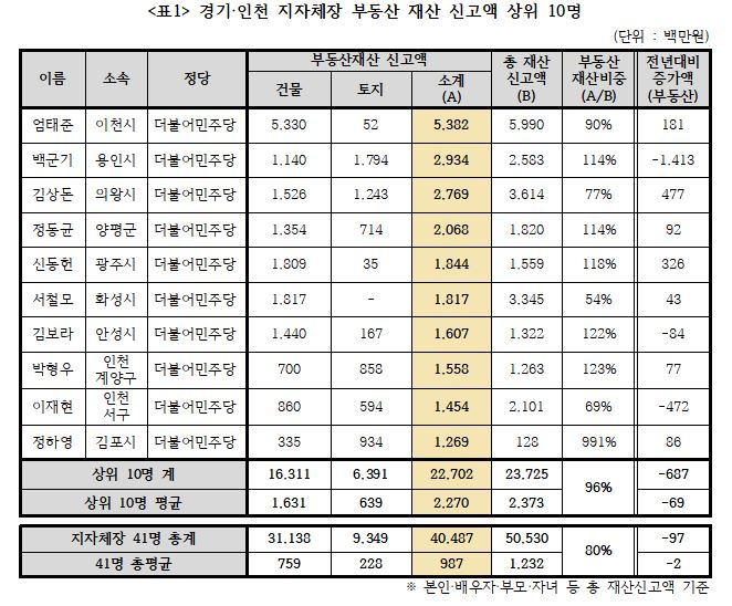 경실련은 경기·인천 41개 시군구 기초 지자체장의 재산신고 내역을 조사한 결과 41명이 신고한 총 재산은 505억원이며, 그중 부동산 재산은 405억원으로 집계됐다고 3일 밝혔다. 지자체장 1인당 평균 재산은 12억3000만원으로, 평균 부동산 재산은 국민 평균 부동산 재산 3억원의 3배가 넘는 9억9000만원이다. 지자체장 보유 재산 중 부동산은 80%를 차지했다.