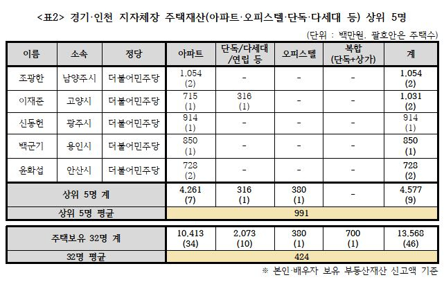 다주택 지자체장은 ▲조광한 남양주시장(2채) ▲이재준 고양시장(2채) ▲윤화섭 안산시장(2채) ▲허인환 인천 동구청장(2채) ▲이강호 인천 남동구청장(2채) ▲최용덕 동두천시장(2채) ▲김정식 인천 미추홀구청장(2채) ▲이성호 양주시장(2채) 등 9명이다. 서철모 화성시장의 경우 6채 보유로 신고했지만 자료공개 시점인 2021년 3월경 5채를 매도하고 양도세 등을 납입했다고 밝혀 제외됐다.