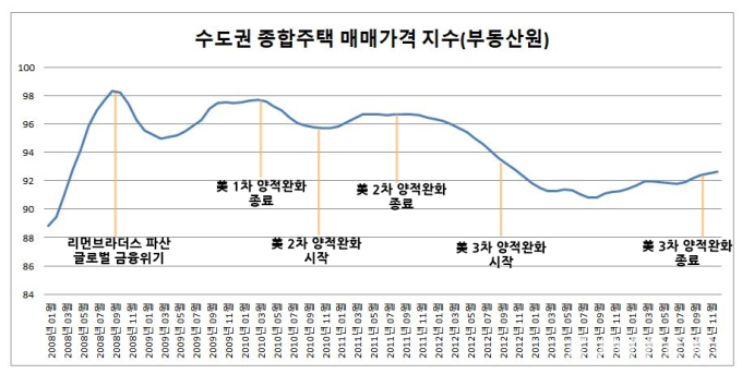 양적완화로 시장이 풀린 돈이 늘어나 상승한 집값은 미국의 1차 양적완화가 종료되면서 다시 하락했다. 주택 매매지수는 미국의 1차 양적완화가 종료된 2010년 3월 97.7에서 2차 양적완화가 시작된 2010년 11월 95.7까지 하락한다. 이는 미국의 2차 양적완화가 시작되면서 2011년 9월 96.7까지 재상승한다.