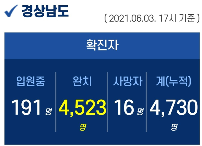 3일 오후 5시 기준 경남도내 입원 중인 확진자는 191명이고, 퇴원 4523명, 사망 16명, 누적 확진자는 총 4730명이다.
