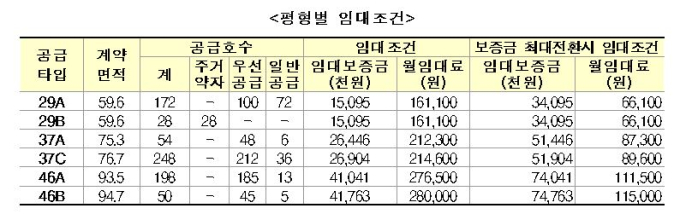 4일 LH에 따르면 이번에 공급하는 주택은 국민임대주택 750가구, 영구임대주택 250가구다. 공급 국민임대주택 유형은 ▲29㎡(200가구) ▲37㎡(302가구) ▲46㎡(248가구) 등 이다. 37A형 기준 임대보증금과 월임대료는 2600만원, 21만2000원이다.