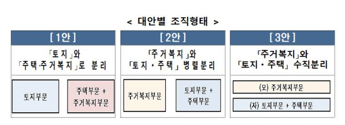 1안은 토지와 주택주거복지를 별도로 분리하는 방안으로 통합 전의 토지공사, 주택공사 체제와 유사한 안이다. 2안은 주거복지 부분과 토지주택, 즉 개발사업 부분으로 병렬적으로 분리하는 방안이다. 3안은 2안과 같이 주거복지 부분과 개발사업 부분으로 분리하되, 주거복지 부분을 모 회사로 두고 개발사업 부분인 토지주택을 자회사로 두는 방안이다.