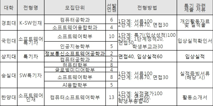 2022학년도에 학생부종합으로 SW인재전형을 운영하는 수도권 대학은 가천대, 광운대, 단국대(죽전), 동국대, 서울여대, 숙명여대, 아주대, 중앙대, 한양대(ERICA), 한국외대 등이다. 서강대는 지난해까지 운영하던 SW우수자전형을 폐지했고, 한국외대는 올해 SW인재전형을 신설했다.