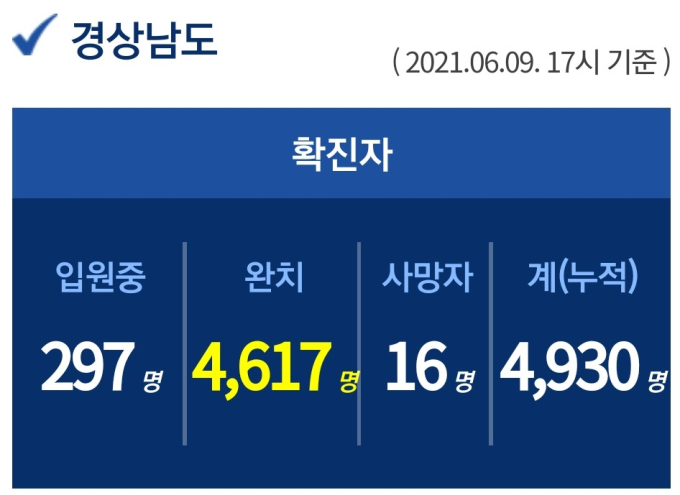 9일 오후 5시 기준 경남도내 입원 중인 확진자는 297명이고, 퇴원 4617명, 사망 16명, 누적 확진자는 총 4930명이다.