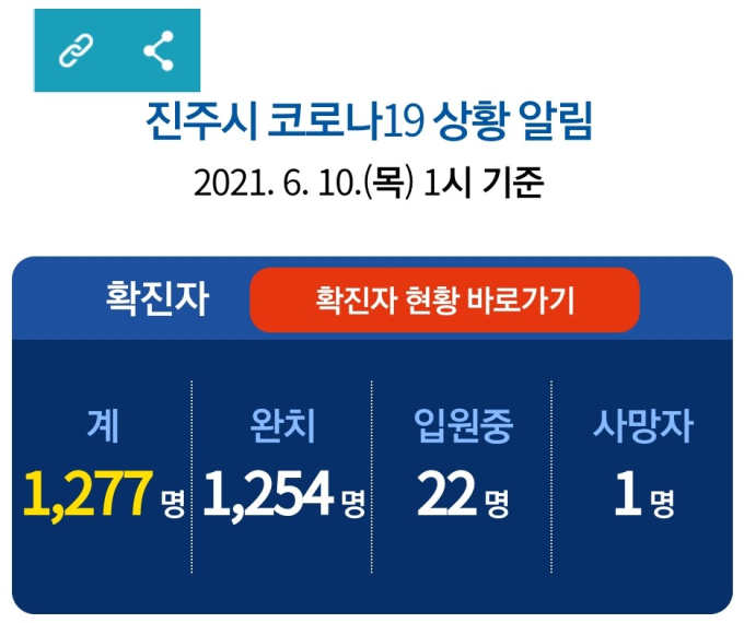 10일 현재 진주시 누적 확진자 1277명 중 완치자는 1254명이며 22명은 입원, 자가격리자는 324명이다.