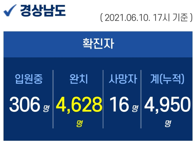 10일 오후 5시 기준 경남도내 입원 중인 확진자는 306명이고, 퇴원 4628명, 사망 16명, 누적 확진자는 총 4950명이다.