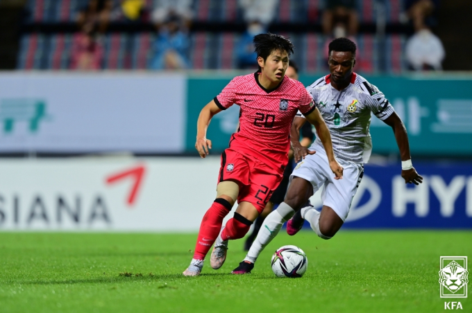 하지만 팀원들과의 호흡은 다소 아쉬움이 남았다. 가나 수비진의 뒤를 노리는 스루패스가 몇 차례 나왔는데 이를 정확히 연결하질 못했다. 과거 U-20 월드컵에서 호흡을 맞췄던 오세훈(김천 상무)을 향해 공을 뿌렸지만 정확도가 떨어졌다. 계속해서 선수들과 소통을 했지만 원하는 플레이를 만들지 못한 모습이었다.