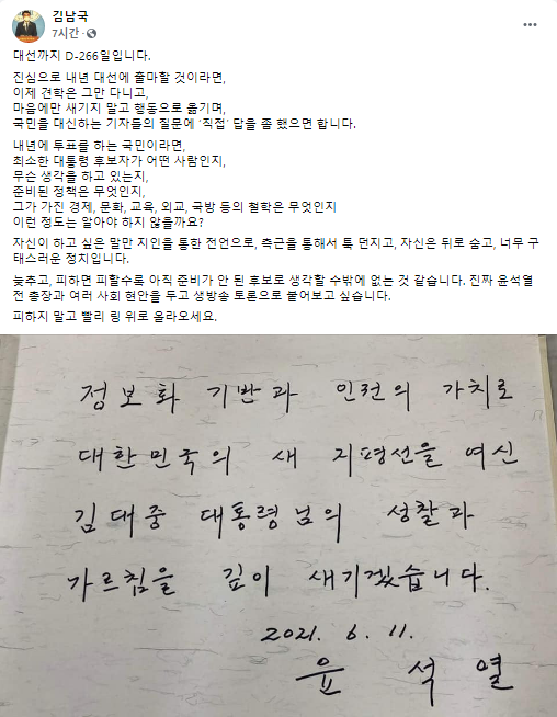김남국 의원은 16일 자신의 SNS에 "대선까지 D-266일"이라며 "진심으로 내년 대선에 출마할 것이라면, 이제 견학은 그만 다니고 마음에만 새기지 말고 행동으로 옮기며, 국민을 대신하는 기자들의 질문에 '직접' 답을 좀 했으면 한다"고 했다.