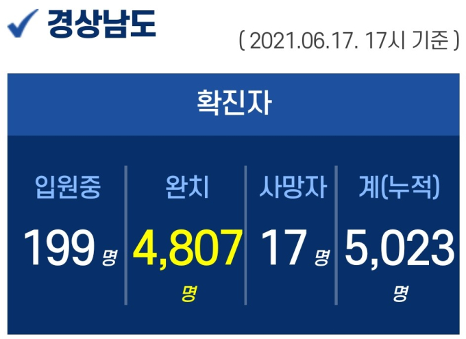 17일 오후 5시 기준, 경남도내 입원 중인 확진자는 199명이고, 퇴원 4807명, 사망 17명, 누적 확진자는 총 5023명이다.