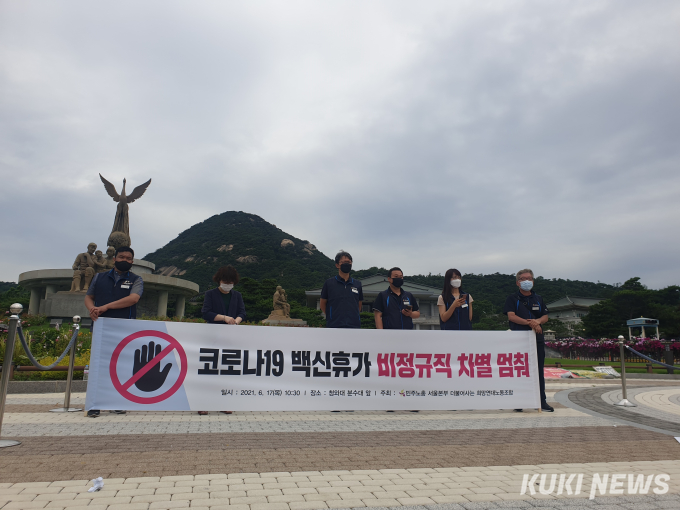 민주노동조합총연맹(민주노총) 서울본부 더불어사는희망연대노동조합(희망연대노조)은 17일 청와대 앞에서 ‘방송통신·공공부문콜센터 비정규직 노동자 백신 휴가 차별 규탄 기자회견’을 진행했다. 이들은 협력(하청)업체 소속으로 대기업과 공공부문 등 원청의 고객응대·설치수리 업무를 대리한다.