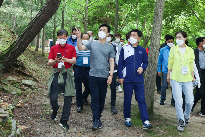 [대전=쿠키뉴스] 명정삼 기자 = 허태정 대전시장은 19일 상소동 산림욕장에서 대전시 통장연합회 회원 25여 명과 함께 토요산책을 진행했다.