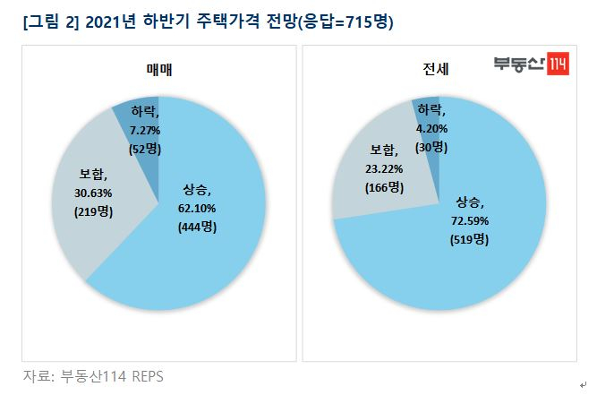 [쿠키뉴스] 조계원 기자 =부동산114는 2021년 6월 1일부터 15일까지 15일간 전국 715명을 대상으로 ‘2021년 하반기 주택 시장 전망’ 설문조사를 실시한 결과 응답자 10명 중 6명(62%)이 상승을 선택했다고 24일 밝혔다. 2021년 상반기(70%)와 비교하면 상승 응답 비중은 다소 줄어들었다.