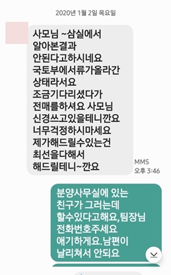제보자는 지금까지 억울함을 토로하며 분양 직원 및 시행사 등을 대상으로 계약해지나 변경을 요구하고 있다. 제보자는 “사과조차 없는 분양 사무실이나 시행사가 너무 뻔뻔하기 그지없다”며 “금쪽같이 귀한 퇴직금을 투자해 조금이나마 안정적으로 살고 싶었을 뿐인데, 앞으로 어디 가서 사람을 믿고 살 수 있을는지 모르겠다”고 말했다.