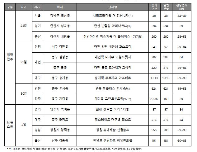 모델하우스는 4곳에서 오픈한다. 대구에서는 ‘힐스테이트 대구역 퍼스트’가 모델하우스를 오픈하며 경남에서는 ‘창원 롯데캐슬 센텀골드’가 모델하우스 문을 연다. 당첨자 발표는 오피스텔 ‘THE GL’ 등 12곳에서 진행한다. 계약은 ‘e편한세상 석림 더노블’ 등 16곳에서 실시할 예정이다.