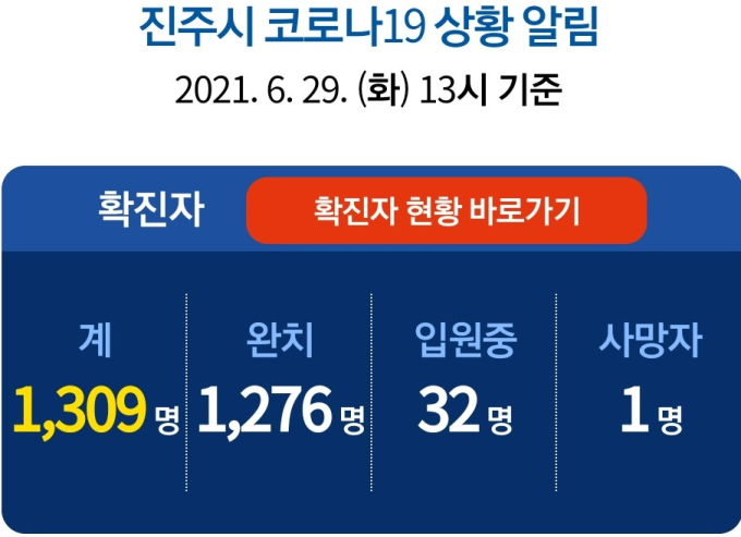 29일 현재 진주시 누적 확진자 1309명 중 완치자는 1276명이며 32명은 입원, 자가격리자는 366명이다.