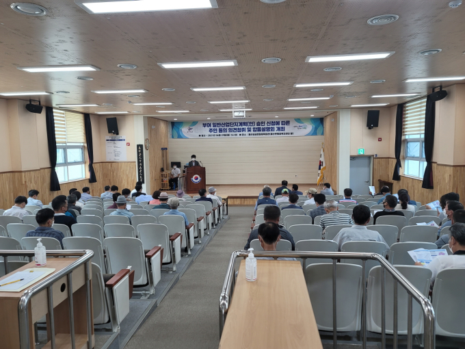 [부여=쿠키뉴스] 오명규 기자 =부여군(군수 박정현)은 29일 부여일반산업단지 조성에 대한 지역주민 의견수렴을 위해 홍산면 공공문화체육회관에서 토지소유자와 마을 주민, 지역추진위원회원 등 70여명이 참여한 가운데 합동설명회를 가졌다고 밝혔다.