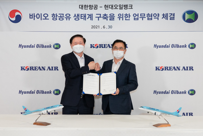 대한항공과 현대오일뱅크는 30일 오전 서울시 강서구 대한항공 본사에서 우기홍 대한항공 사장, 강달호 현대오일뱅크 사장 등 양사 관계자들이 참석한 가운데 ‘바이오항공유 제조 및 사용 기반 조성 협력을 위한 양해각서(MOU)’를 체결했다.