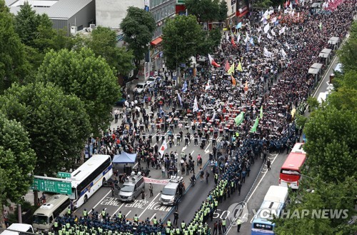 민주노총 자체 추산 8000명 조합원들은 굵은 빗방울이 떨어지는 상황에서도 '비정규직 철폐하라', '구조조정 중단하라', '최저임금 인상하라' 등의 구호를 외치며 행진했다.