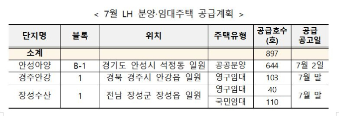 지역별로 보면 경기도 안성시 석정동 일원에 공공분양 644호, 경북 경주시 안강읍 일원에 영구임대 103호, 전남 장성군 장성읍 일원에 영구임대 40호와 국민임대 110호가 입주자를 모집한다.