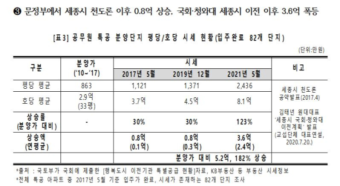 경실련에 따르면 국민은행 통계 기준으로 세종시 아파트값은 문재인 정부 이후 116%, 한 채당 3억이 올랐고, 2020년 이후에만 무려 2억7000만원이 뛰었다. 경실련은 문재인 정부와 집권여당의 설익은 세종시 개발정책이 집값을 끌어올린 것으로 지적했다.