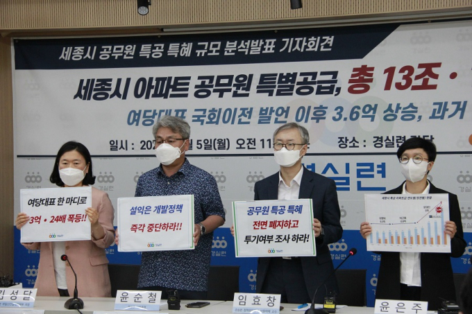 경실련은 “집권여당은 서울 집값 잡는 근본대책은 외면한 채 ‘국가균형발전’으로 포장한 설익은 개발정책을 추진했고, 그 결과 서울 집값도 못 잡고 세종 집값을 잔뜩 올려 특공 공무원들에게 수조원의 불로소득을 안겨줬다”고 비판했다.