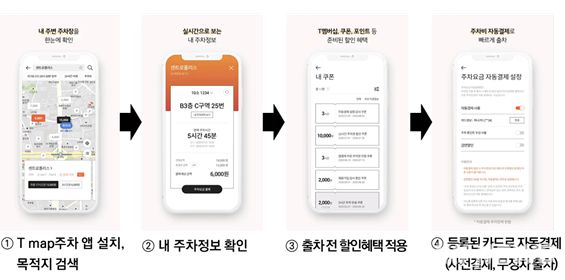 스마트 주차시스템은 스마트폰 앱 Tmap을 통해 공영주차장 검색, 요금결제, 현황정보 등을 조회하고, 무인으로 운영이 가능하다.