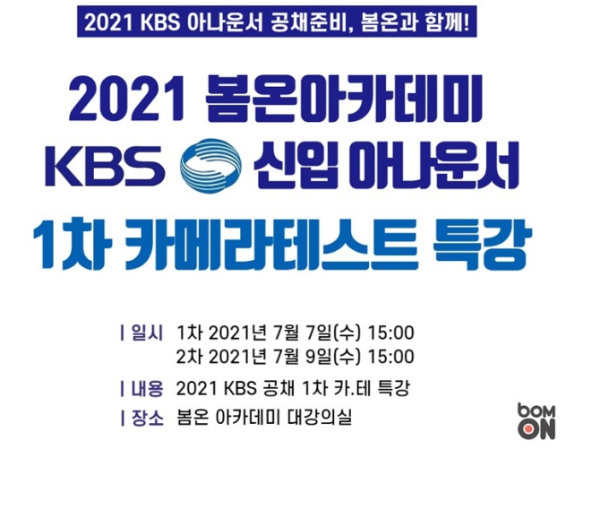 봄온 아카데미 담당자는 “오는 7월 11일에 진행되는 1차 카메라테스트를 대비하는 아나운서 지망생들을 위해 특강을 진행한다”며 “1차, 2차 특강으로 2번 진행하며 이번 2021 KBS 아나운서 공채에 맞춰 꿀팁 그리고 점검을 동시 진행한다. 이번 특강은 비대면(Zoom)특강을 함께 하며 공식 홈페이지를 통해 신청할 수 있다”고 말했다.