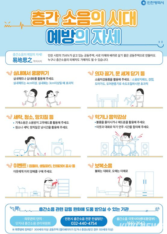 이지영 인천시 층간소음 전문 컨설팅단 위원은 “층간소음 갈등해결은 항의방문 등 직접 대응보다 관리사무소(층간소음 관리위원회) 또는 ‘인천시 층간소음 전문 컨설팅단’ 등 관련기관 중재를 요청하는 것이 문제해결에 도움이 된다”고 말했다.