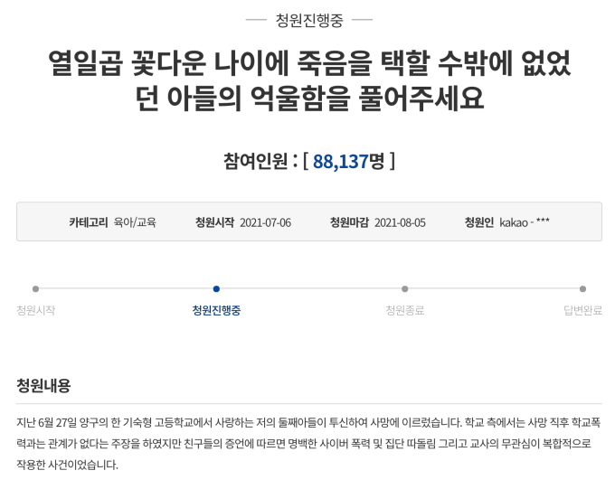 청와대 국민청원 게시판에는 학폭으로 사망한 학생 사건에 대해 진상조사를 해달라는 청원이 2건 올라왔다. 9일 오전 기준 각각 11만, 8만6000여명이 동의했다.