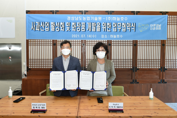 [진주=쿠키뉴스] 강연만 기자 = 경남농업기술원(원장 정재민)이 도내 지역특산 화장품 제조업체인 ㈜하늘호수(대표 서미자)와 사과 가공품을 활용한 다양한 화장품 개발 및 사과 가공산업 활성화를 위해 업무협약을 체결했다.