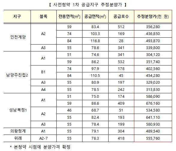 성남복정1과 위례신도시의 경우 지가가 다른 입지보다 높아 3.3m2 당 2400~2600만원으로 산출되었으며, 전용면적59m2는 6억7600만원, 전용면적55m2는 5억5000~6억4000만원 수준이 될 전망이다.