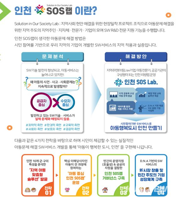 인천 SOS랩 사업은 아동학대, 교통안전, 성범죄, 교육문제 등 아동문제를 시민과 아동, 기업이 협력해 아이디어를 도출하고 SW솔루션을 개발하는 사업이다.