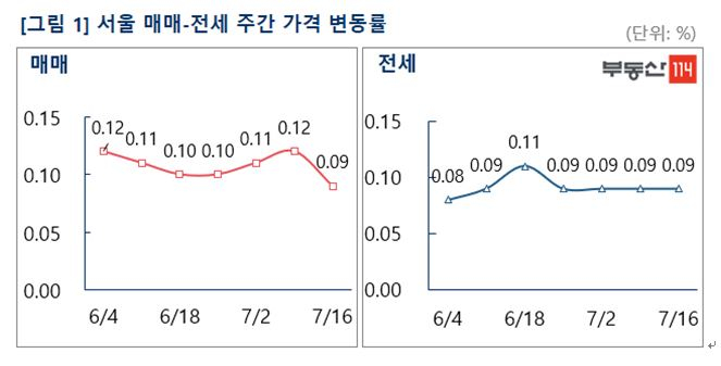 [쿠키뉴스] 조계원 기자 =부동산114에 따르면 7월 둘째 주(16일기준) 서울 아파트 매매가격은 0.09% 올라 전주 대비 상승폭이 축소됐다. 재건축(0.10→0.07%)과 일반(0.12→0.09%) 아파트 모두 상승폭이 줄었다.