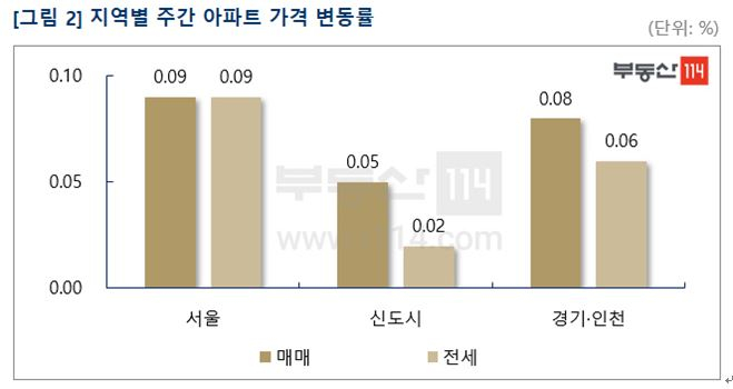 경기·인천(0.09→0.08%)과 신도시(0.05→0.05%)도 상승폭이 축소되거나 전주와 동일했다. 전세 시장은 서울(0.09%→0.09%)과 경기·인천(0.06→0.06%)의 상승폭이 전주 수준을 유지했고, 신도시(0.01→0.02%) 소폭 올랐다.