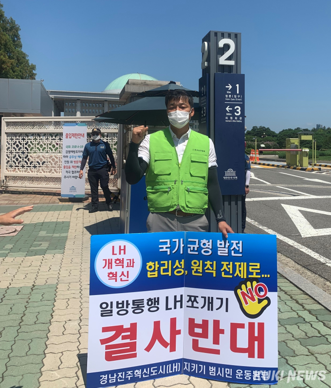 [진주=쿠키뉴스] 강연만 기자 = LH 해체를 반대하는 1인 시위가 국회앞에서 연일 이어지고 있는 가운데 (사)환경실천협회(박대성 총재)가 16일 국회 앞 1인 시위에 동참하고 나섯다.