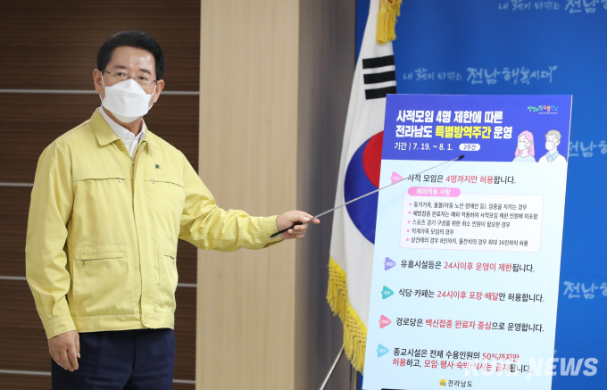 김영록 도지사는 19일, 전남도청 브리핑룸에서 비수도권 5명 이상 사적 모임 금지에 따른 도민 발표문을 통해 이같이 밝히고 수도권 등 타지역 방문 자제, 불가피한 방문시에는 귀가 즉시 검사, 다중이용시설과 사업장은 냉방시설 사용 시 자주 환기할 것을 당부했다.
