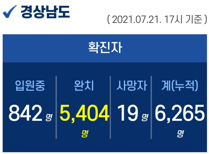 21일 오후 5시 기준, 경남도내 입원 중인 확진자는 842명이고, 퇴원 5404명, 사망 19명, 누적 확진자는 총 6265명이다.