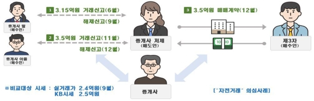 그 결과 총 69건의 법령 위반 의심사례를 확인했으며 특히 이 중 자전거래·허위신고로 의심되는 12건의 거래를 적발했다. 실거래가 띄우기는 자녀와 친인척을 이용해 집값을 띄운 후 제3자에게 시세 보다 비싸게 매각하는 방식으로 교묘하게 이뤄졌다. 또 아파트 분양대행사 관계자가 자신들의 명의로 아파트를 비싸게 사들인 것처럼 조작해 시세 보다 높은 가격에 팔아치우고 이득을 챙겼다.