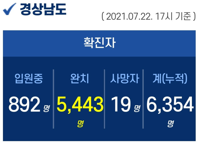 22일 오후 5시 기준, 경남도내 입원 중인 확진자는 892명이고, 퇴원 5443명, 사망 19명, 누적 확진자는 총 6354명이다.