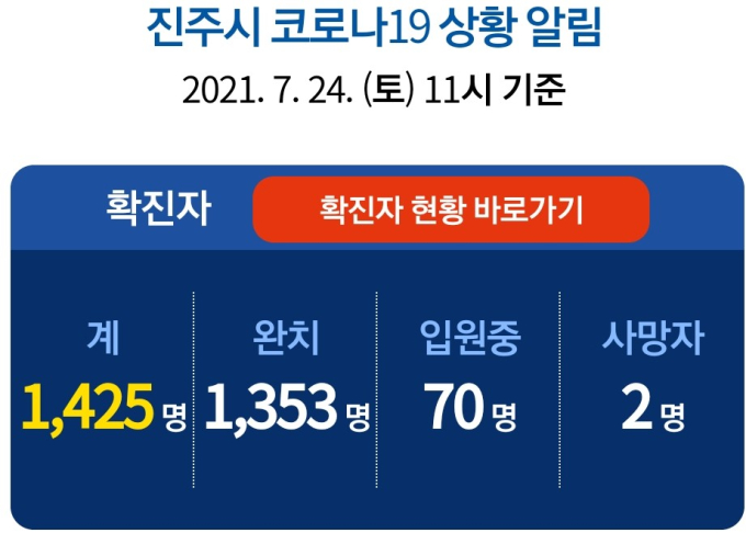 24일 현재 진주시 누적 확진자 1425명 중 완치자는 1353명이며 70명은 입원, 자가격리자는 1173명이다.