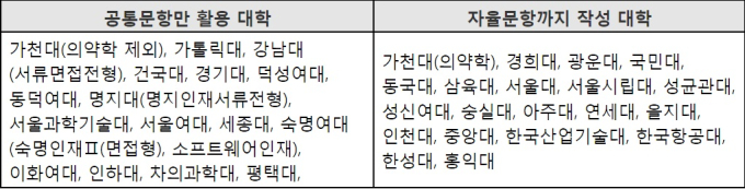 반면, 가천대(의약학), 경희대, 광운대, 국민대, 동국대, 삼육대, 서울대, 서울시립대, 성균관대, 성신여대, 숭실대, 아주대, 연세대, 을지대, 인천대, 중앙대, 한국산업기술대, 한국항공대, 한성대, 홍익대 등은 자율문항을 추가로 요구하고 있다.