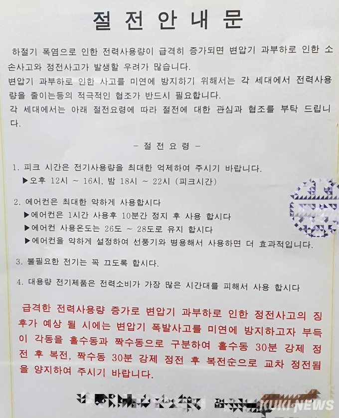 잇단 정전사태에 일부 아파트단지에서는 관리사무소가 단지 내 게시판에 안내문을 붙여 '전력사용이 급증하는 낮 12시~오후 4시, 오후 6~10시 사이에는 전기사용을 자제해 달라'고 주민들에 호소하기도 했다.