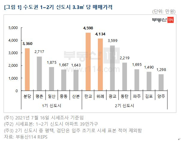 2기 신도시 중 가장 높은 곳은 판교로 3.3㎡ 당 4598만원을 나타냈고, 두번째 높은 곳도 성남 지역이 포함된 위례신도시(3.3㎡ 당 4134만원)로 확인됐다. 1~2기 신도시에서 가장 높은 곳들이 경기도 성남을 공통적으로 포함했다고 볼 수 있다.