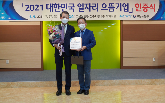 SK넥실리스는 27일 고용노동부와 일자리위원회가 주관하는 ‘2021 대한민국 일자리 으뜸기업’으로 선정돼 대통령 인증패를 받았다.