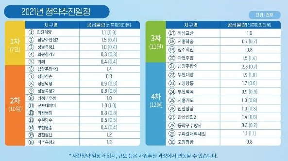 1차 사전청약 접수는 다음달 11일까지 진행한다. 1차 접수 지역은 인천 계양 1천50호, 남양주 진접2 1천535호, 성남 복정1 1천26호, 의양 청계2 304호, 위례 418호 등이다.