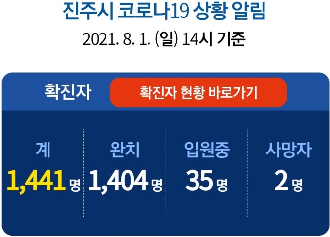 1일 현재 진주시 누적 확진자 1441명 중 완치자는 1404명이며 35명은 입원, 자가격리자는 419명이다.